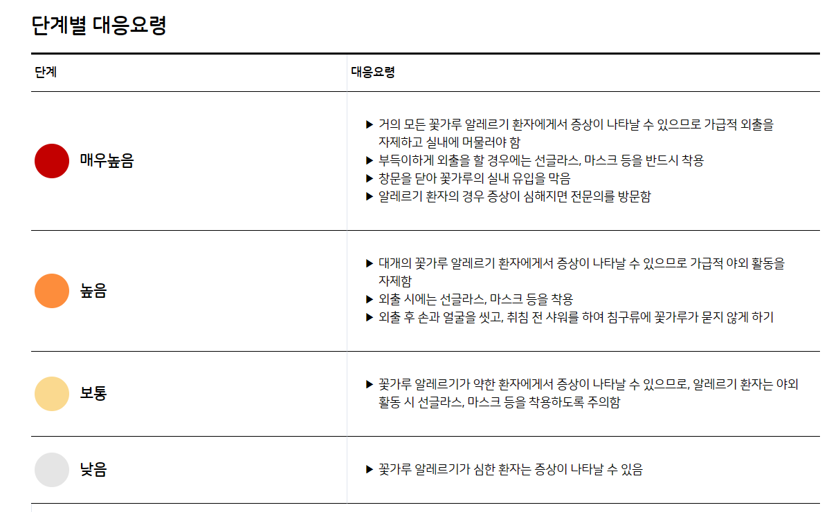 봄철에는 외출하기 전에 기상청 날씨누리에서 제공하는 꽃가루농도위험지수를 확인하는 것이 좋습니다.