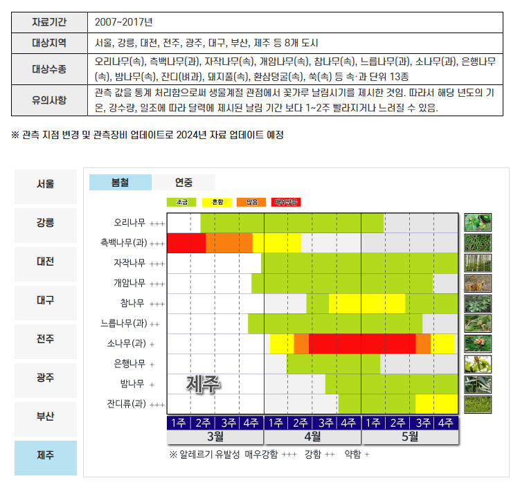 국립기상과학원에서는 주요 도시 8곳의 꽃가루 달력을 제공하고 있습니다.