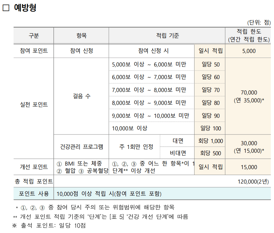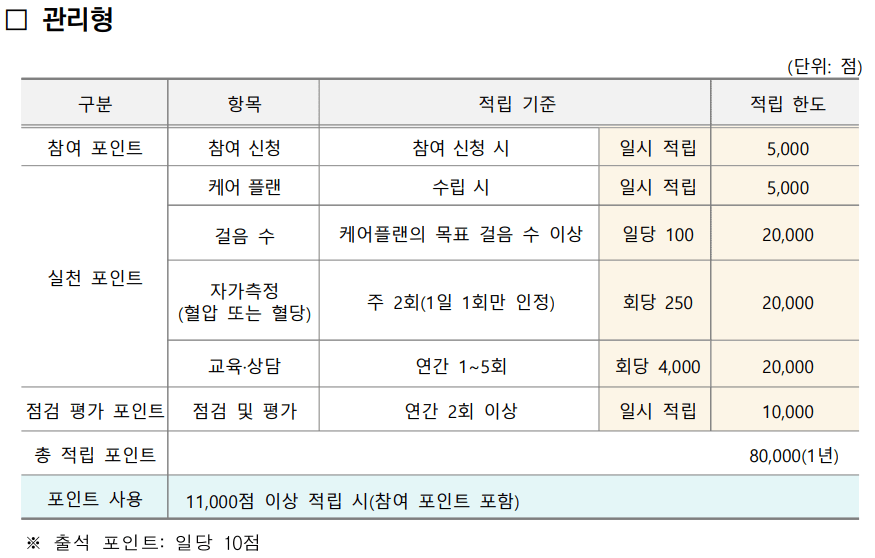 예방형과 관리형에 따라 포인트 적립 방식이 다르니, 아래 포인트 적립 기준을 참고하시고 해당되는 부분의 포인트를 받아보세요.