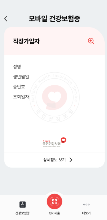 병원, 약국에서 사용하실 때 모바일 건강보험증 어플을 열고 메인 화면 하단에 'QR제출'을 클릭하면 QR 코드가 뜹니다. 이것을 병원 접수처에 보여주시면 신분 확인이 됩니다.