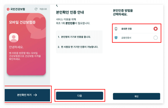 본인 확인을 위해 휴대전화나 금융 인증서를 사용하여 모바일 건강보험증을 발급받으실 수 있으며, 일부 의료기관에서는 이를 통해 신속하게 건강보험 자격을 확인할 수 있습니다.