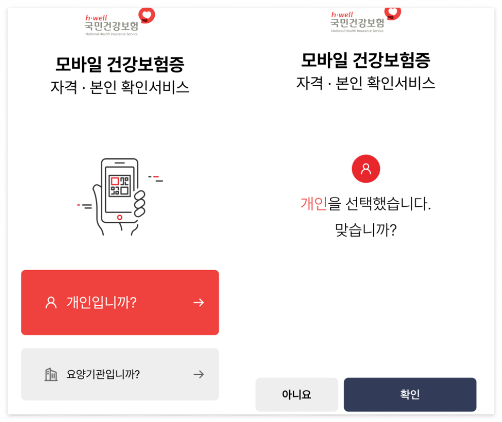 2. 모바일 건강보험증 어플을 열고 '개인'을 선택합니다.