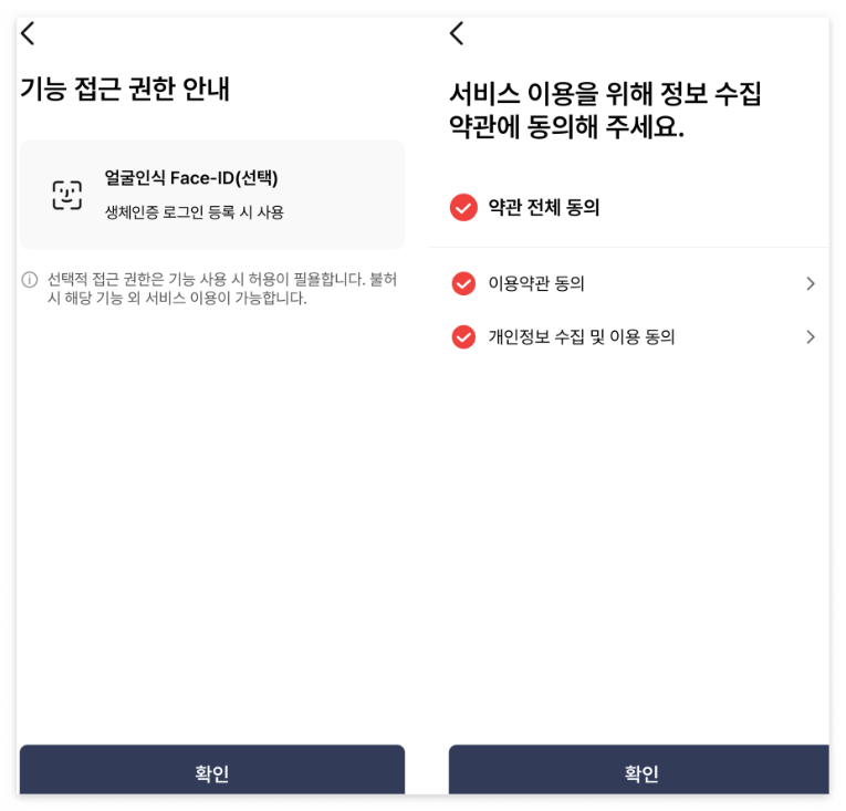 3. 언어를 '한국어'로 설정해 주고 약관에 동의합니다. 생체인증은 선택사항이라 필요하면 인증해 둡니다.