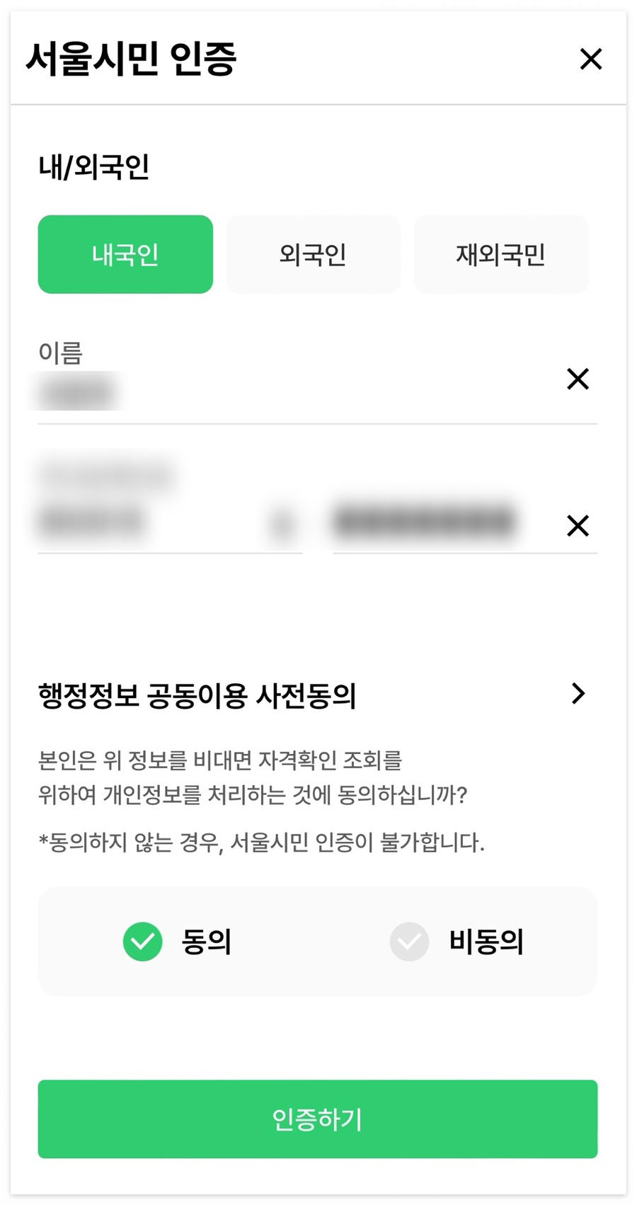 3. 서울시에서 진행하는 사업이기 때문에 서울시민 인증을 거쳐야 합니다. 이름과 주민등록번호를 입력하면 알아서 인증이 됩니다.