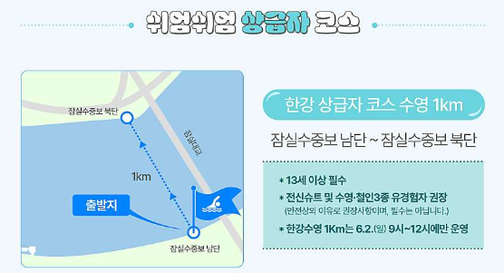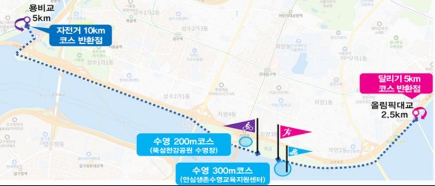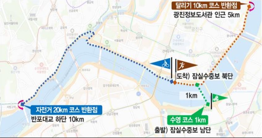 | 상급자 코스 | 한강수영 1km + 자전거 20km + 달리기 10km | 6.1. | 09:00/13:00/16:00 |
