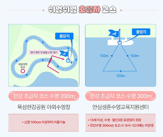 - 안심생존수영교육지원센터에서하는 한강 수영 300m 참여는 13세 이상만 참여 가능합니다.