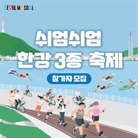 쉬엄쉬엄 한강 3종 축제는 2024년 6월 1일(토) ~ 6월 2일(일) 이틀간 뚝섬한강공원에서 개최되는 축제로 한강을 달리고, 자전거 타고, 헤엄도 치며 나만의 속도와 방식으로 48시간 안에 수영, 자전거, 달리기를 쉬엄쉬엄 완주하기만 하면 되는 생활체육축제 입니다.