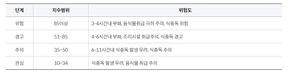이 지수는 온도와 미생물의 증식 기간과의 관계를 고려하여 식중독 발생 가능성을 숫자로 나타낸 것으로, 일정 수치 이상이 되면 식중독 발생 위험이 높아진다고 볼 수 있습니다. 식중독 지수는 다음과 같이 분류됩니다